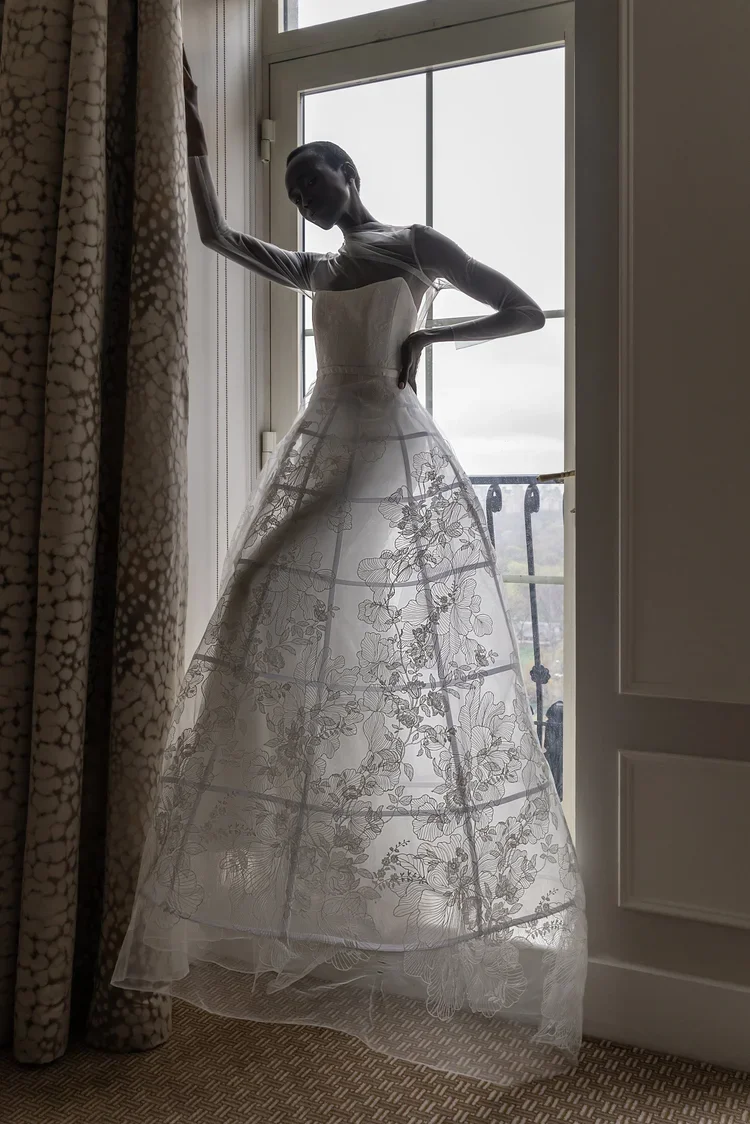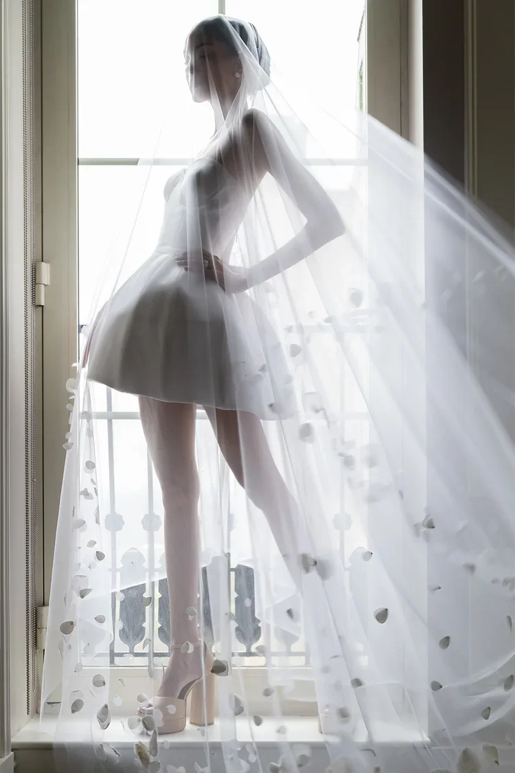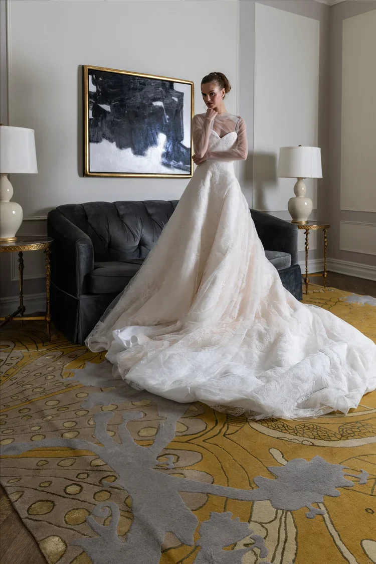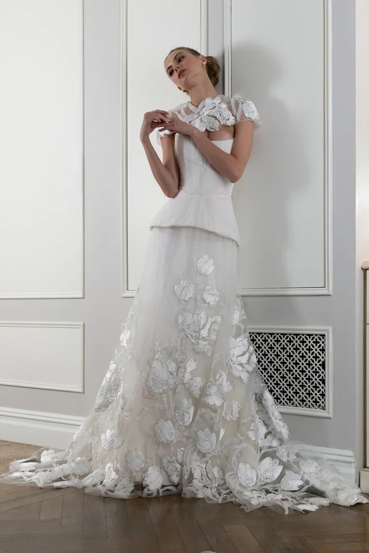 “Our dresses symbolize a timeless connection, reminiscent of old churches, adorned with vintage headpieces.”