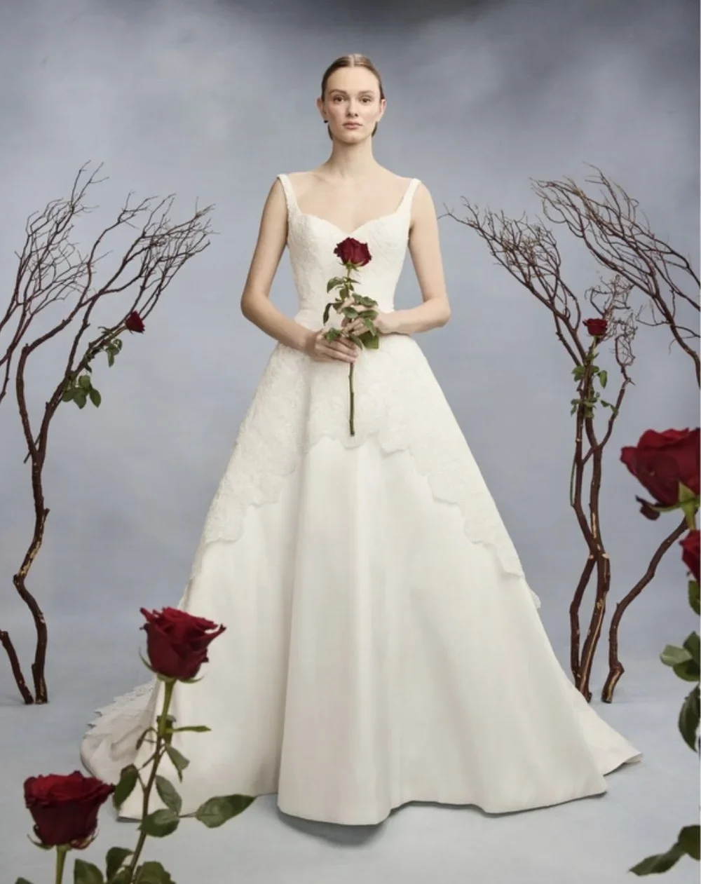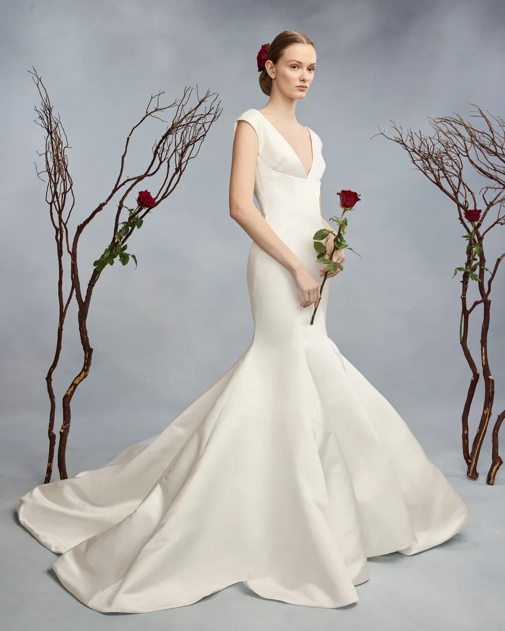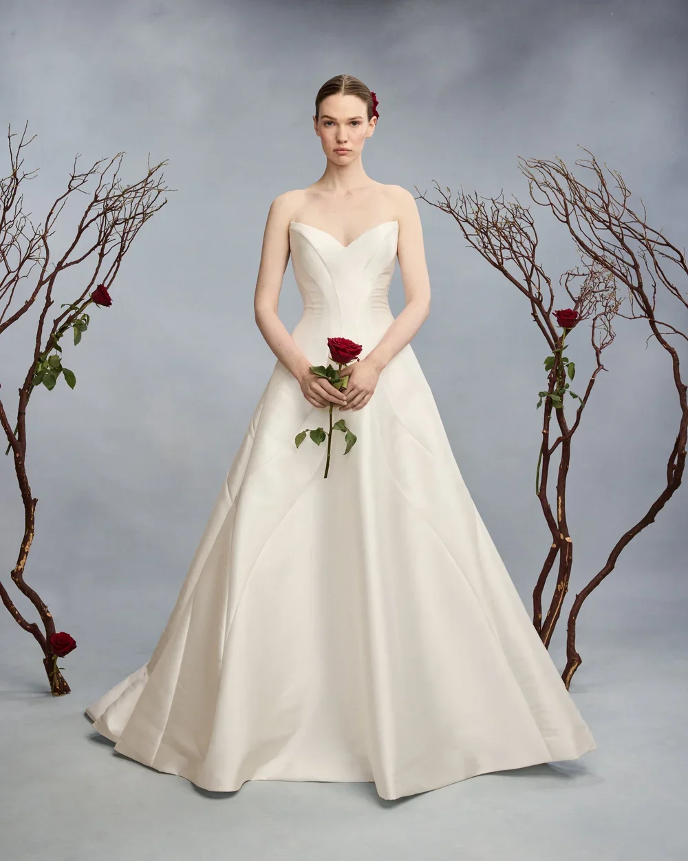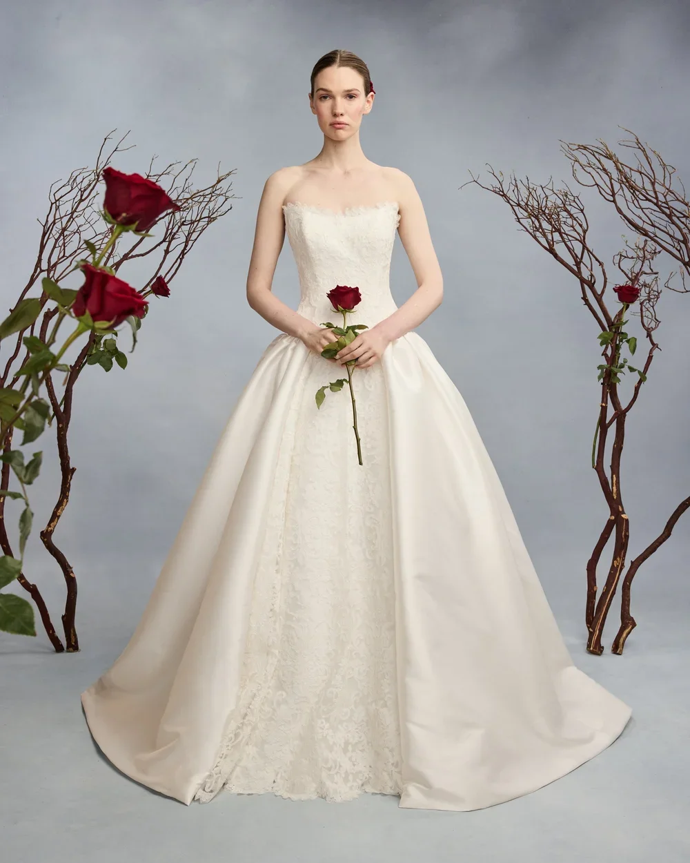 “Lush fabrications- crepe sable, tulle, and silk organza- recall the dewy softness of rose petals at dawn.”