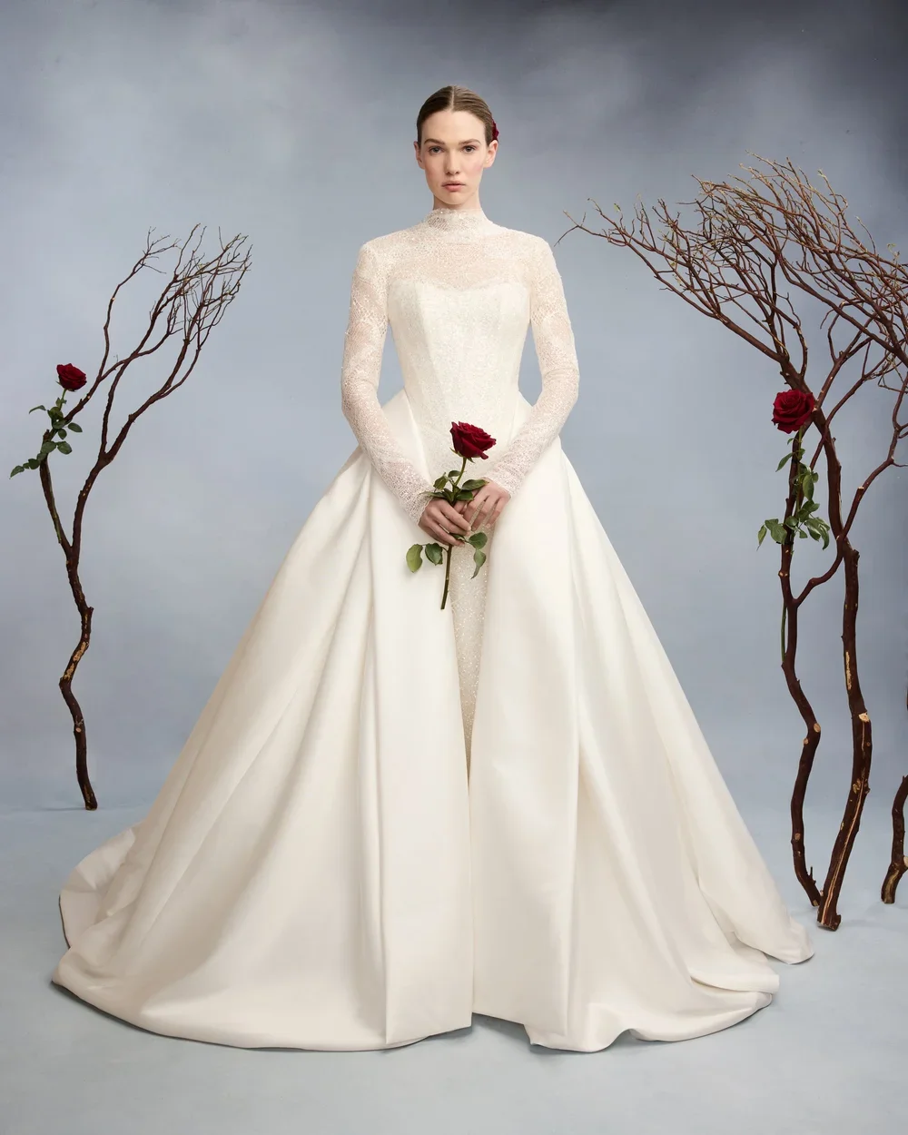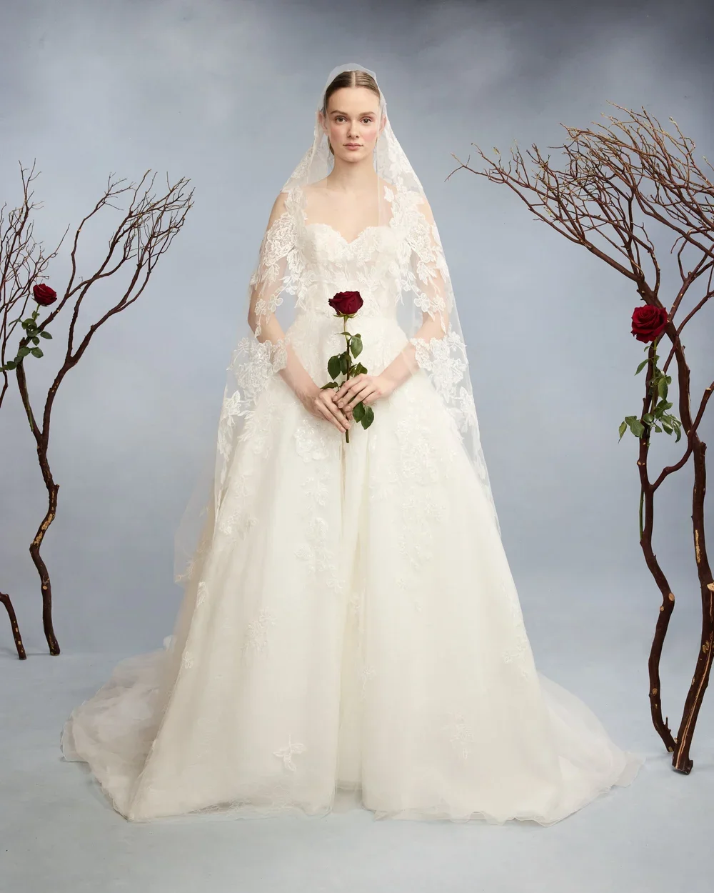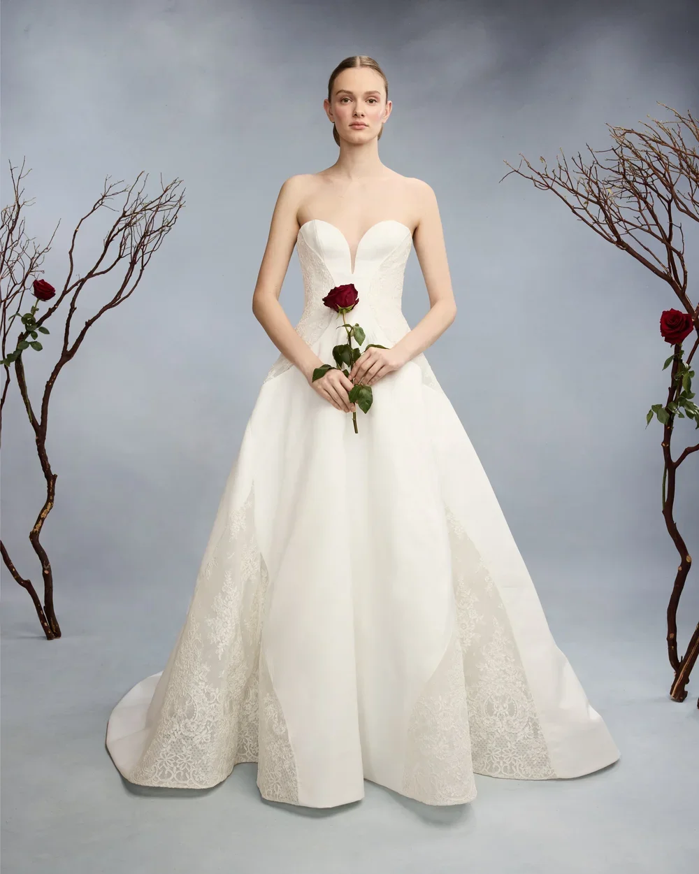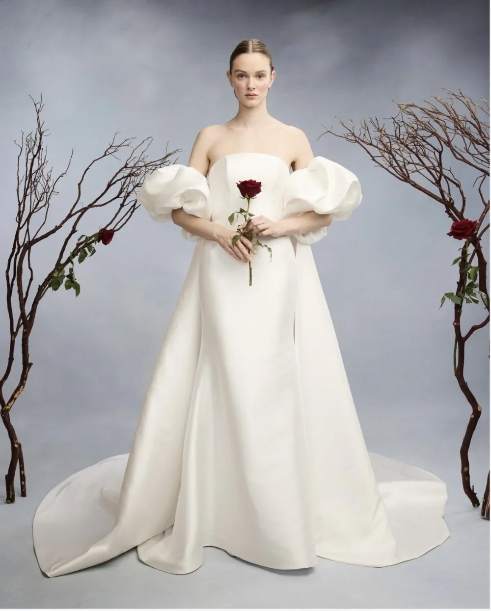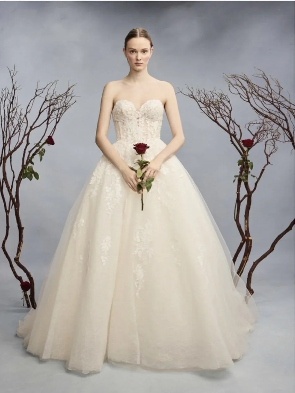 “Lush fabrications- crepe sable, tulle, and silk organza- recall the dewy softness of rose petals at dawn.”