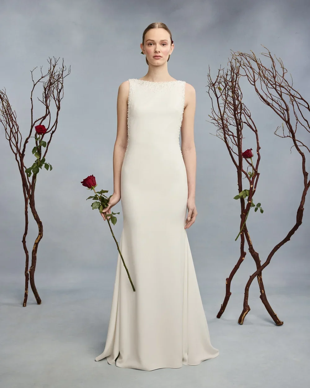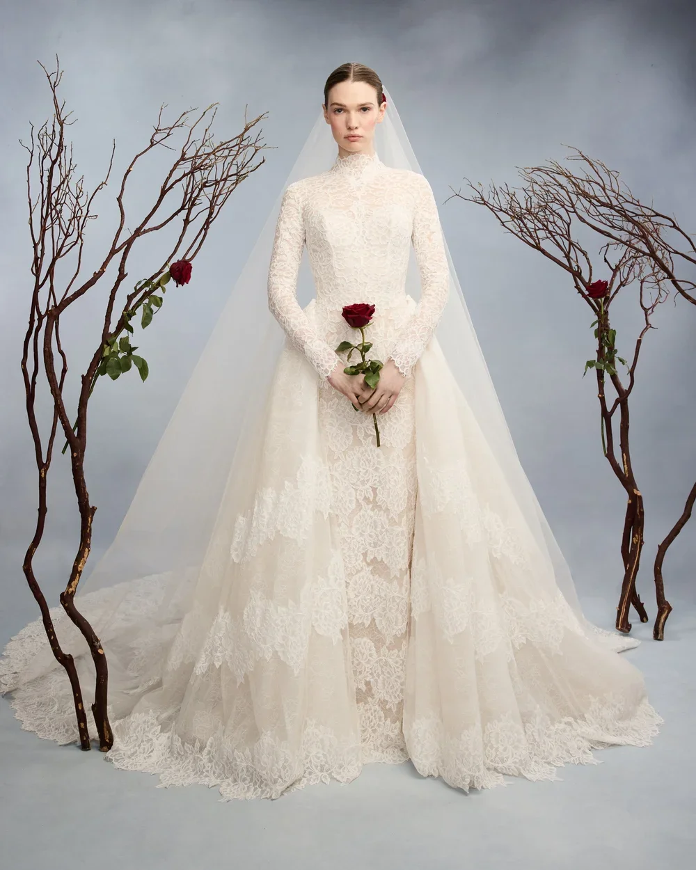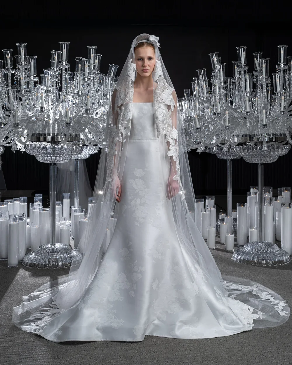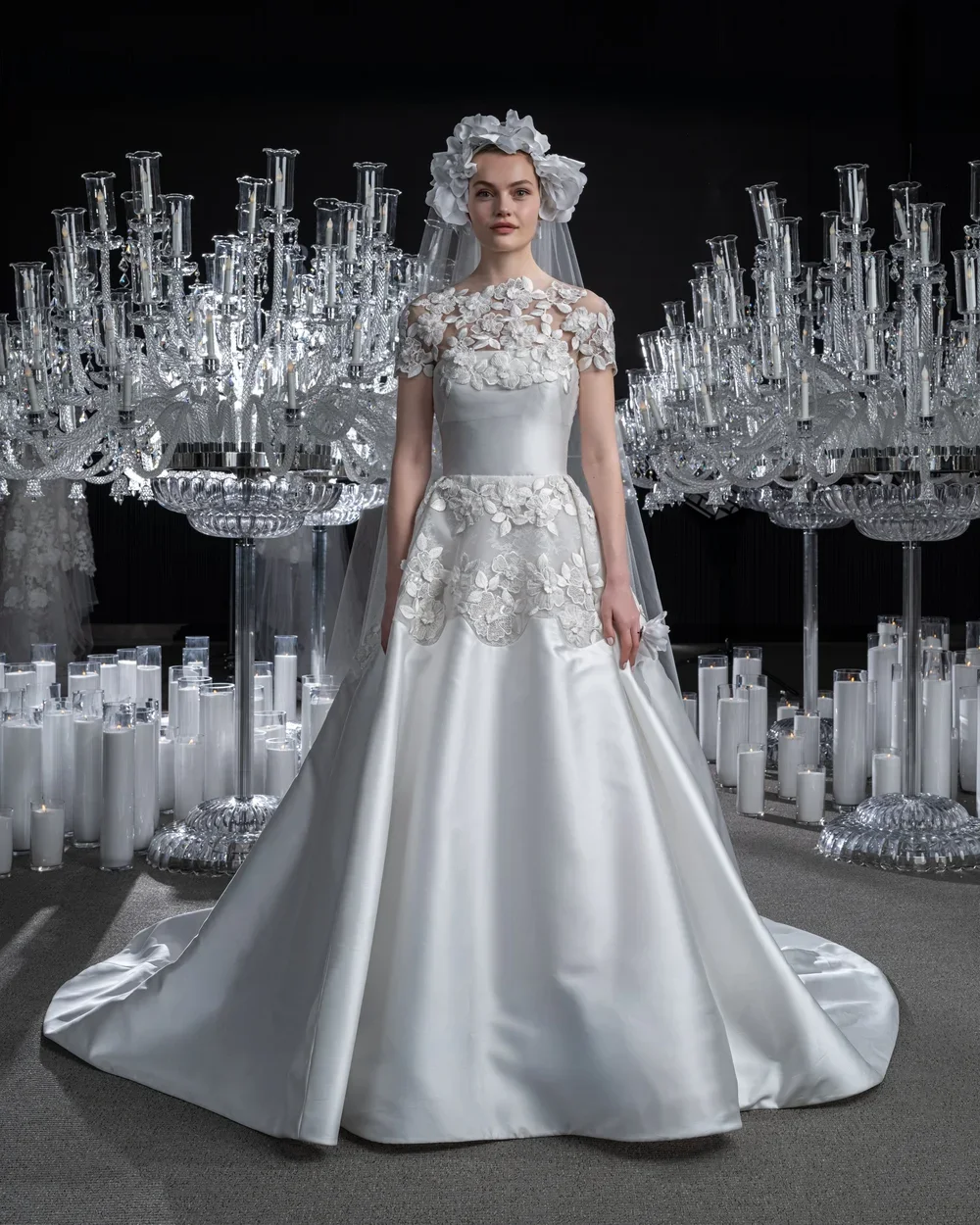 “Lush fabrications- crepe sable, tulle, and silk organza- recall the dewy softness of rose petals at dawn.”