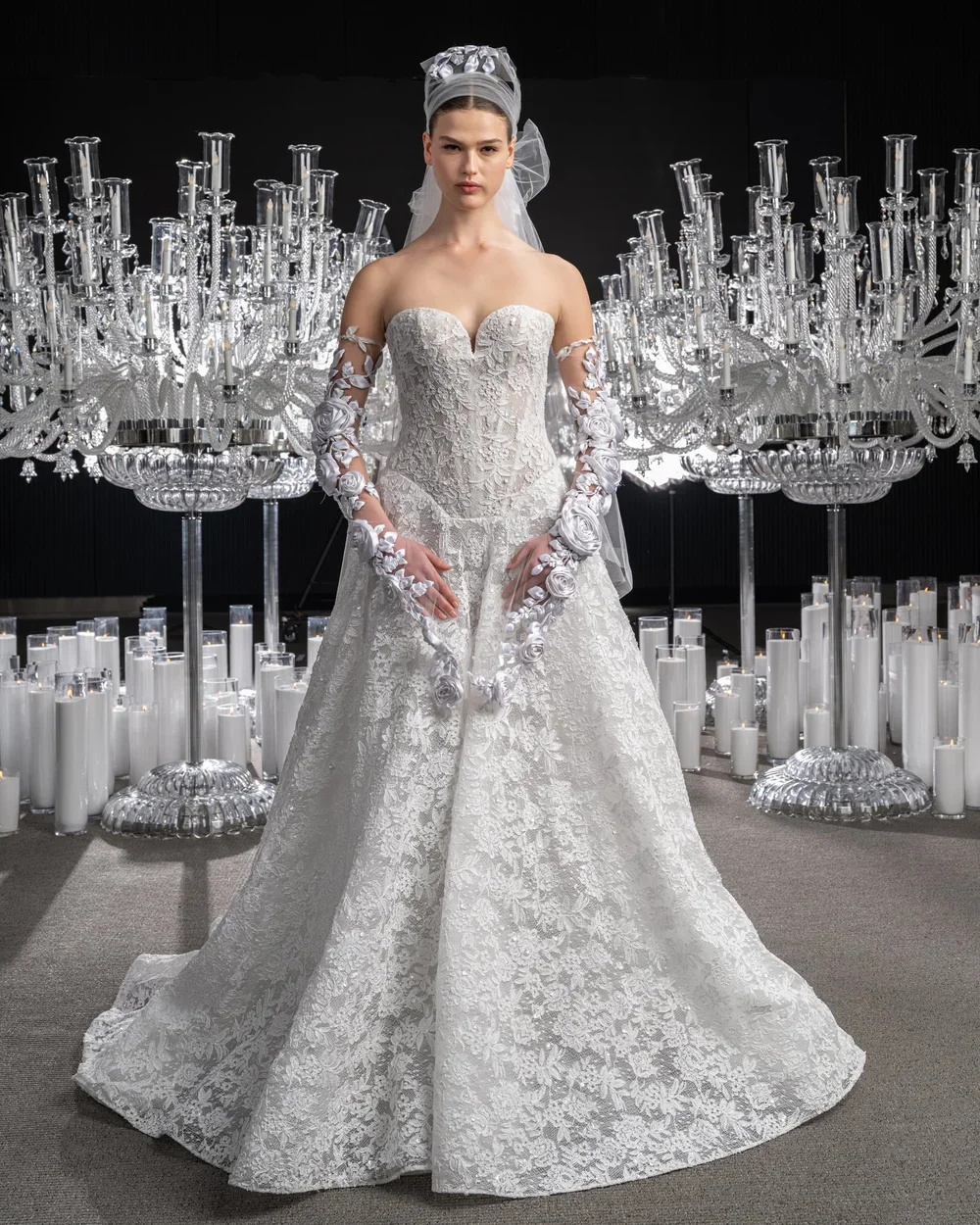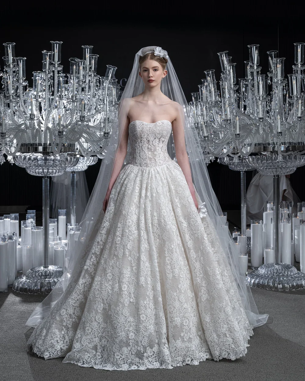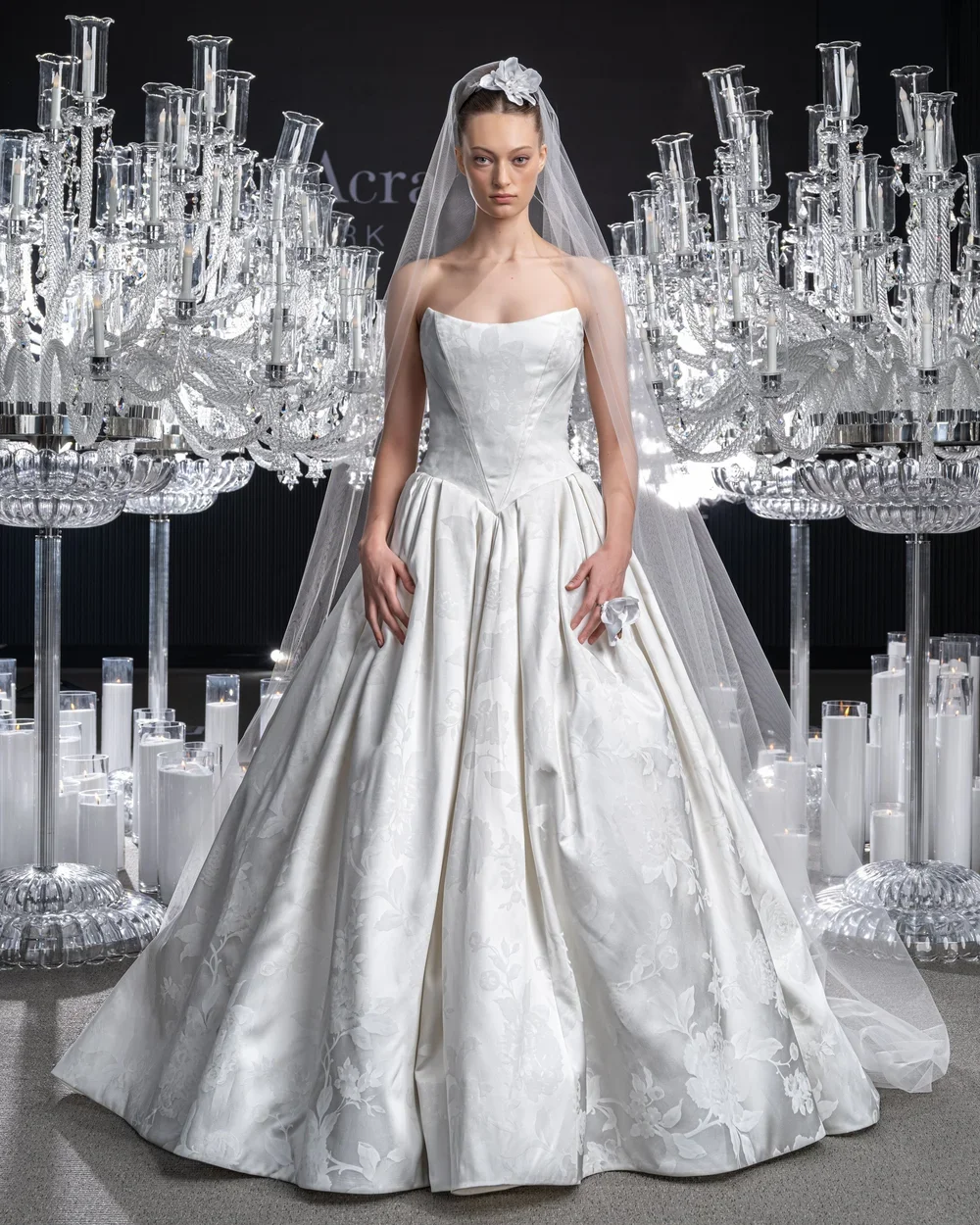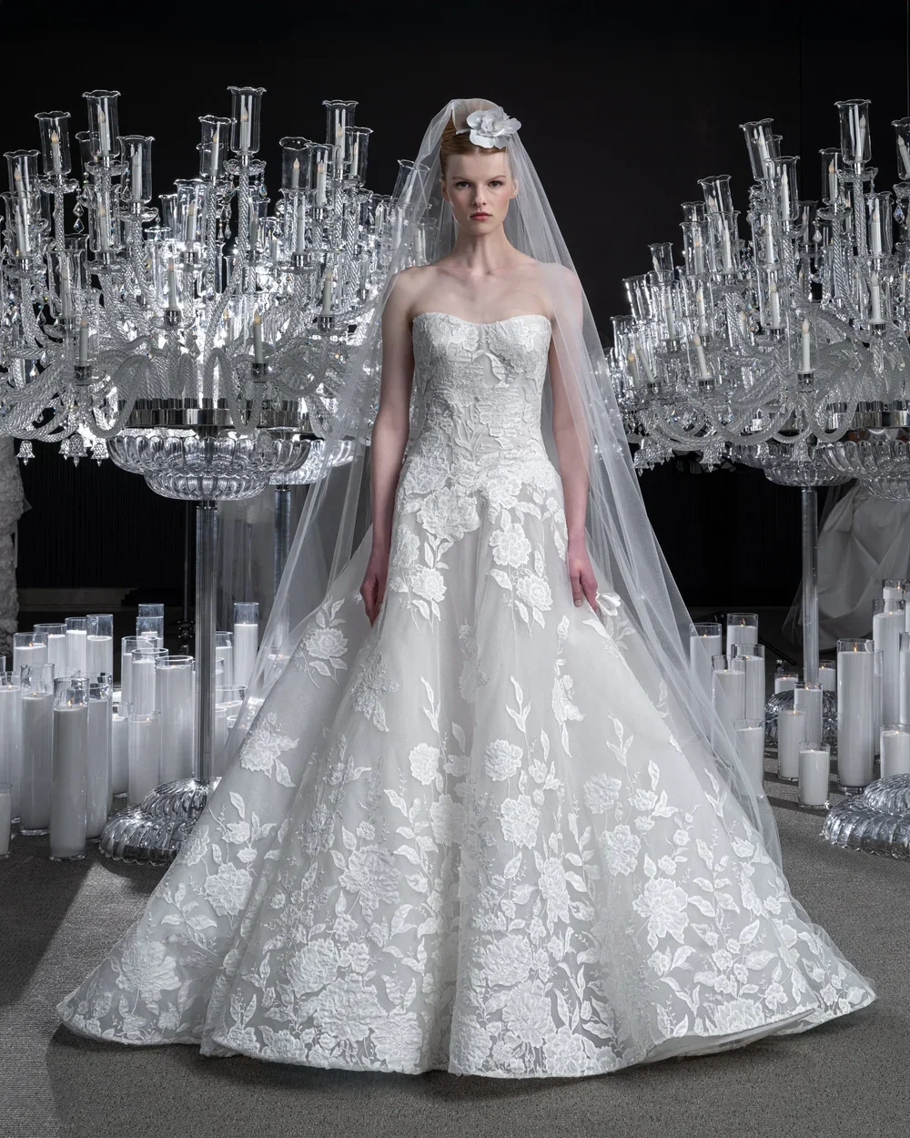 “Lush fabrications- crepe sable, tulle, and silk organza- recall the dewy softness of rose petals at dawn.”